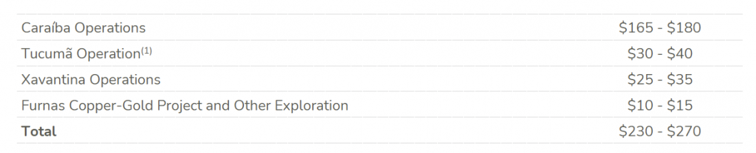 Capital expenditure guidance remains unchanged at a range of $230 to $270 million, excluding capitalized ramp-up costs prior to the declaration of commercial production at the Tucumã Operation.