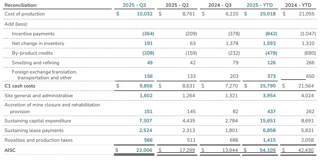 The following table provides a reconciliation of gold C1 cash cost and gold AISC to cost of production, its most directly comparable IFRS measure.
