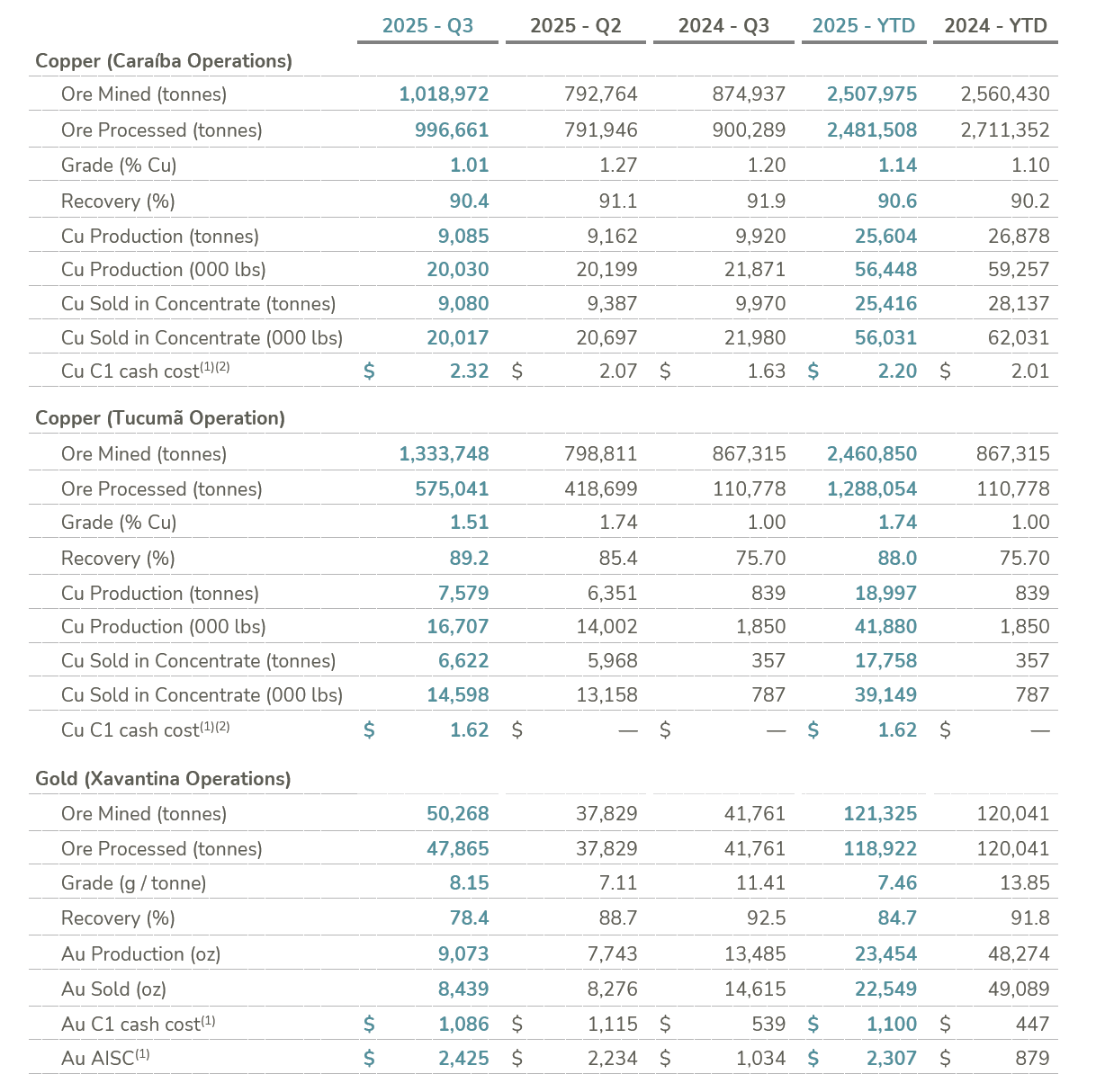 - The Company is reaffirming full-year production and capital expenditure guidance for all assets, as well as full-year cost guidance for Caraíba and Xavantina, while increasing cost guidance for the Tucumã Operation to reflect higher-than-expected maintenance and freight costs. The Company continues to expect Q4 2025 to be the strongest production quarter of the year across its operations.