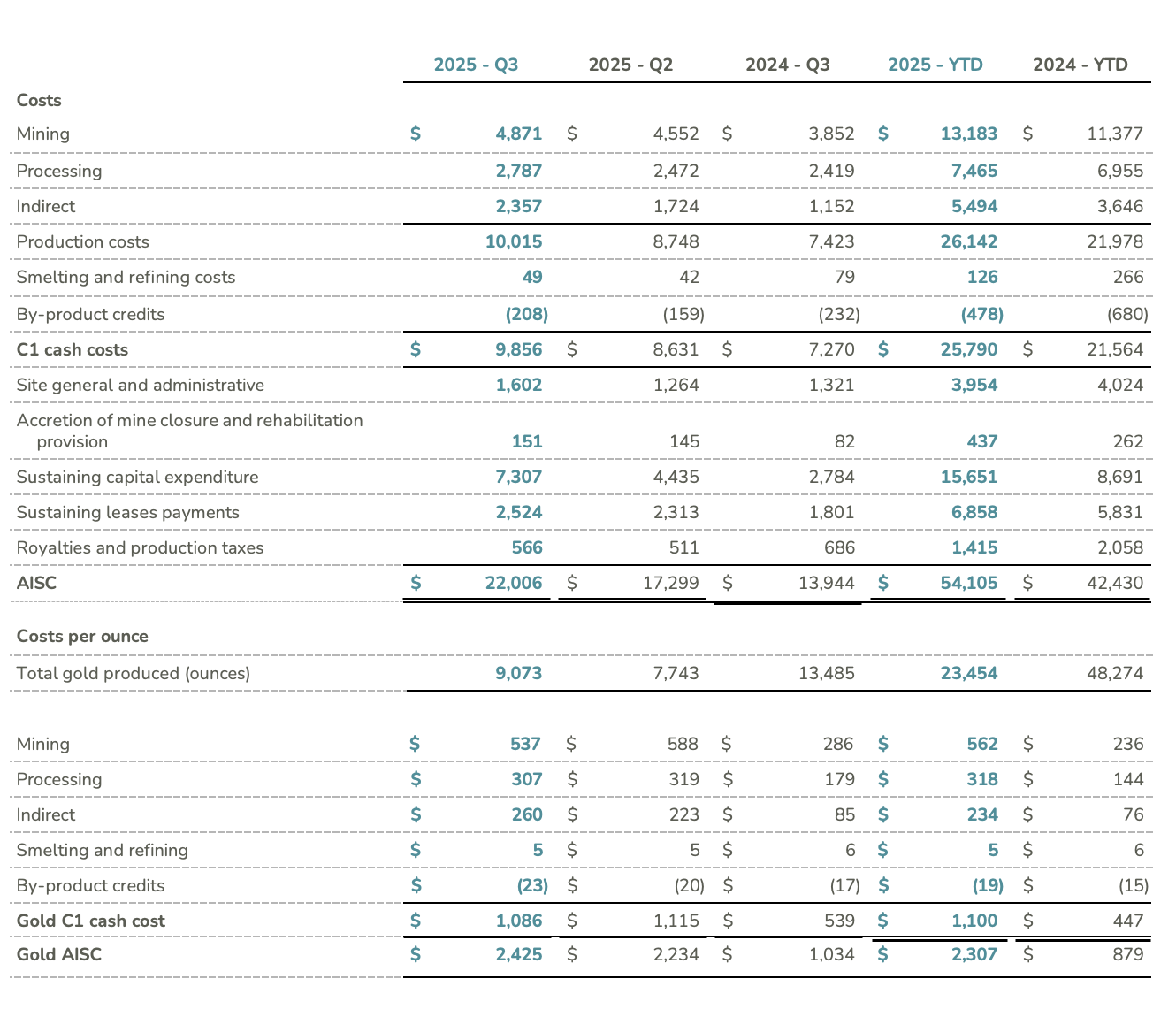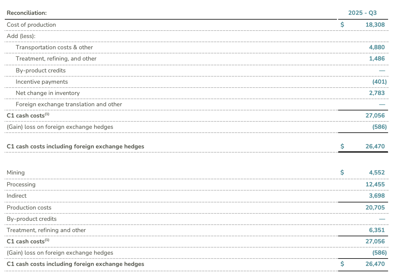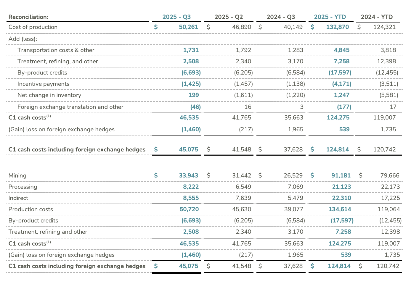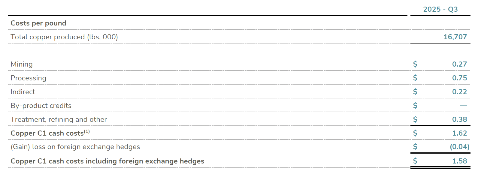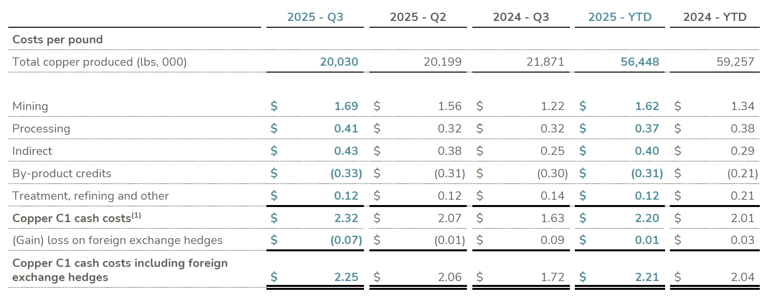 (2) Copper C1 cash cost including foreign exchange hedges was $2.25 in Q3 2025 (Q3 2024 - $1.72) for the Caraíba Operations, and $1.58 in Q3 2025 for the Tucumã Operation.
