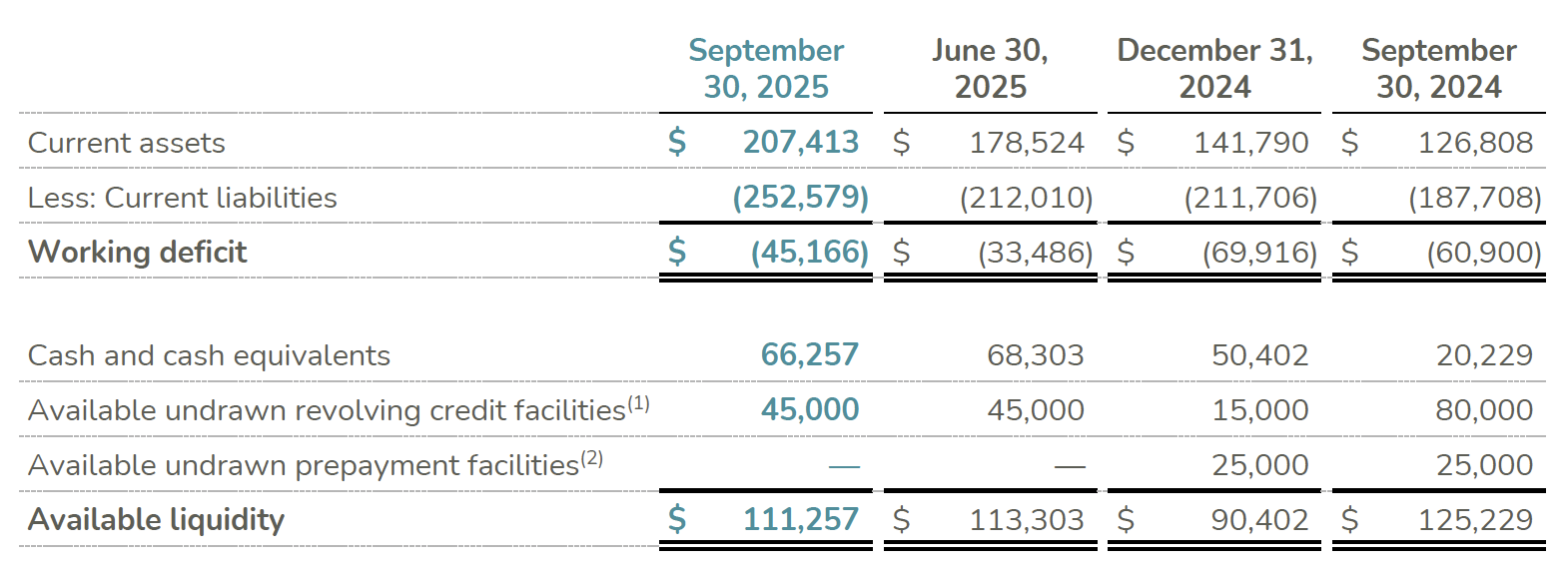 - At quarter-end, available liquidity(1) was $111.3 million, including $66.3 million in cash and cash equivalents and $45.0 million of undrawn availability under the Company's senior secured revolving credit facility ("Senior Credit Facility").