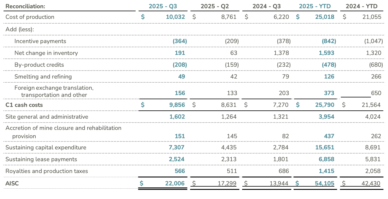 The following table provides a reconciliation of gold C1 cash cost and gold AISC to cost of production, its most directly comparable IFRS measure.